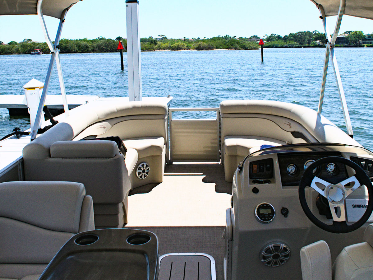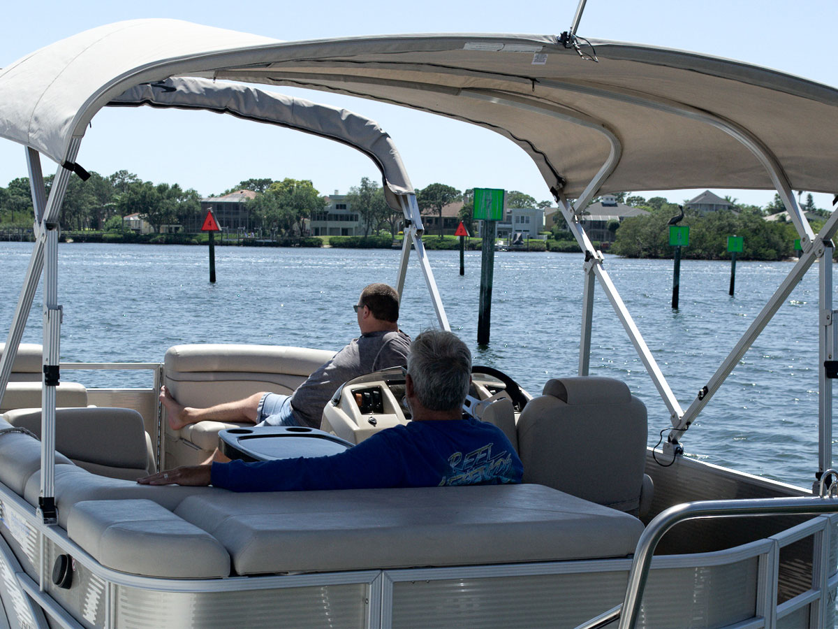 Our 22 Foot Tritoon Rental can accommodate up to 10 people and is fully equipped with a complete or partial canopy, stereo, and GPS navigation. This large Tritoon boat rental is an activity for all to enjoy and is perfect for exploring all the beautiful sites of Palm Harbor, Anclote Key, Tarpon Springs, The North Sand Bar, and Three Rooker Island.